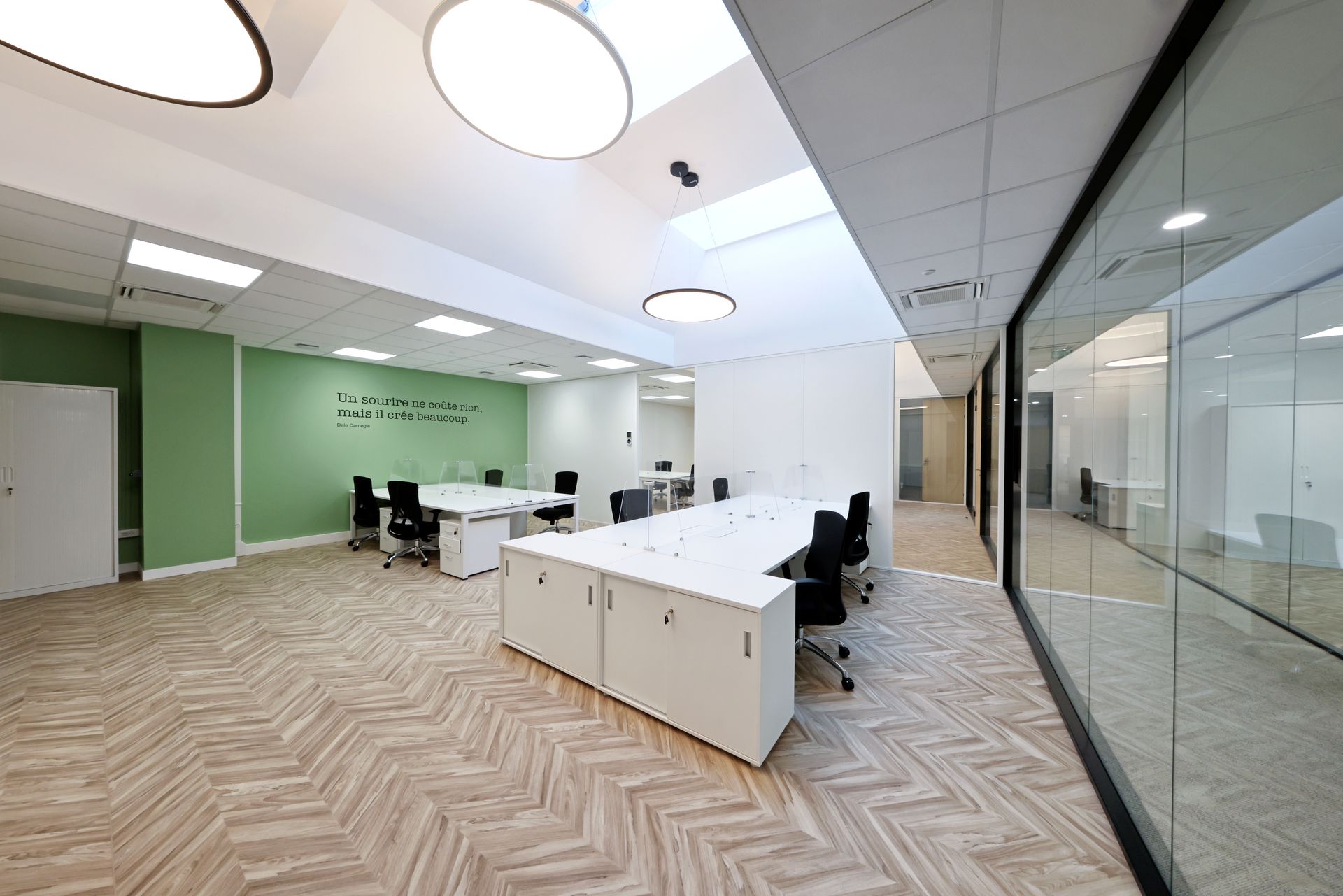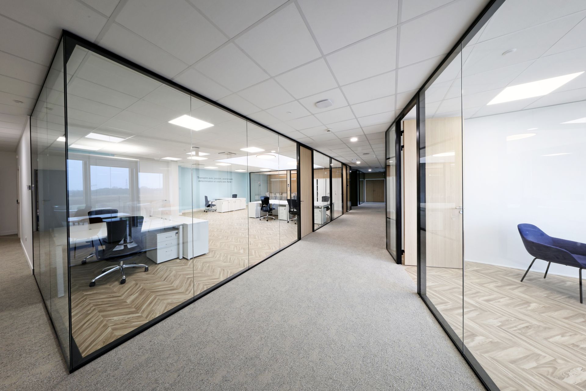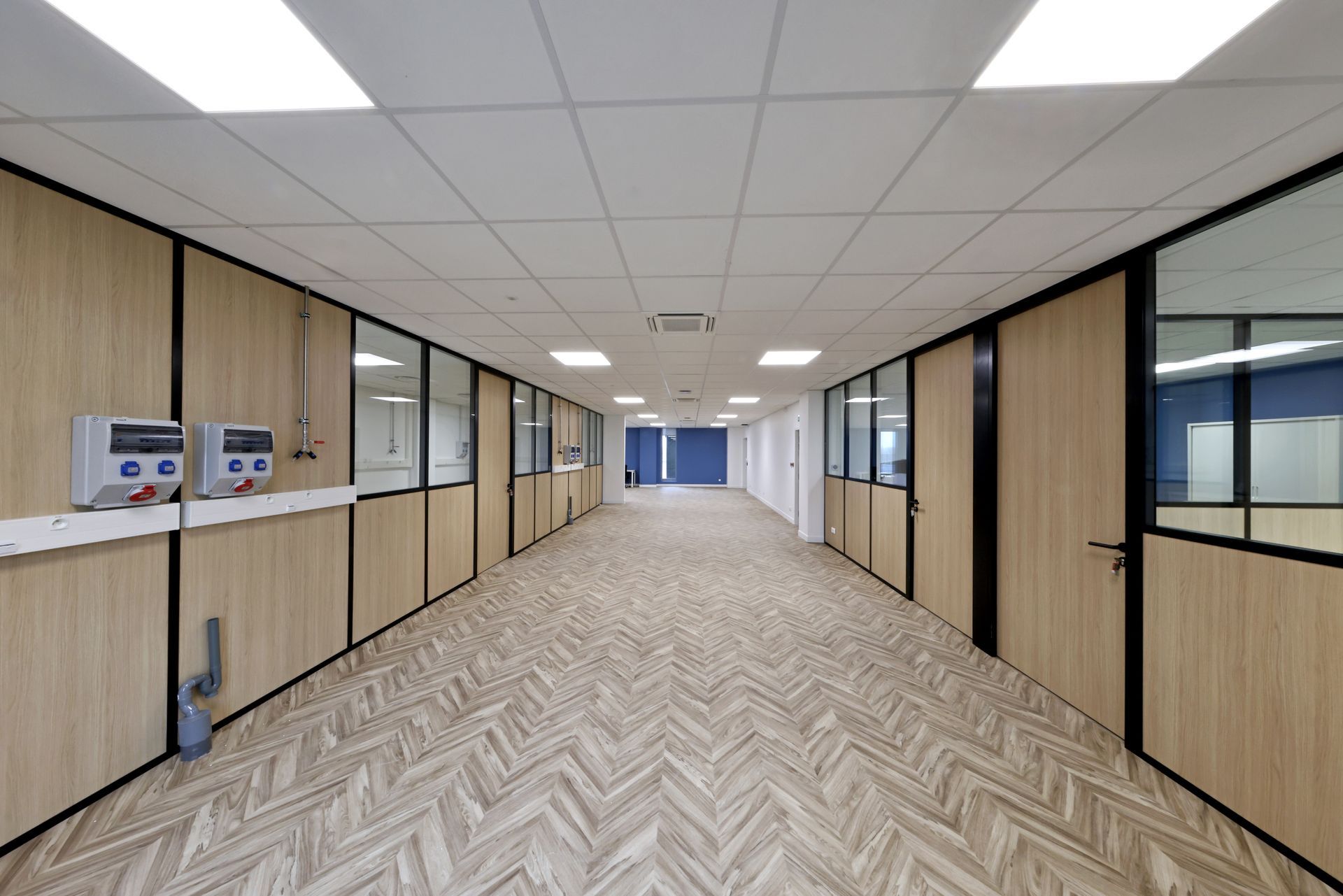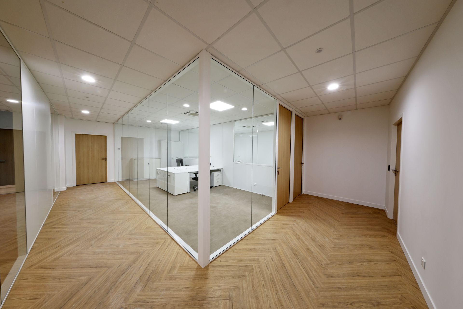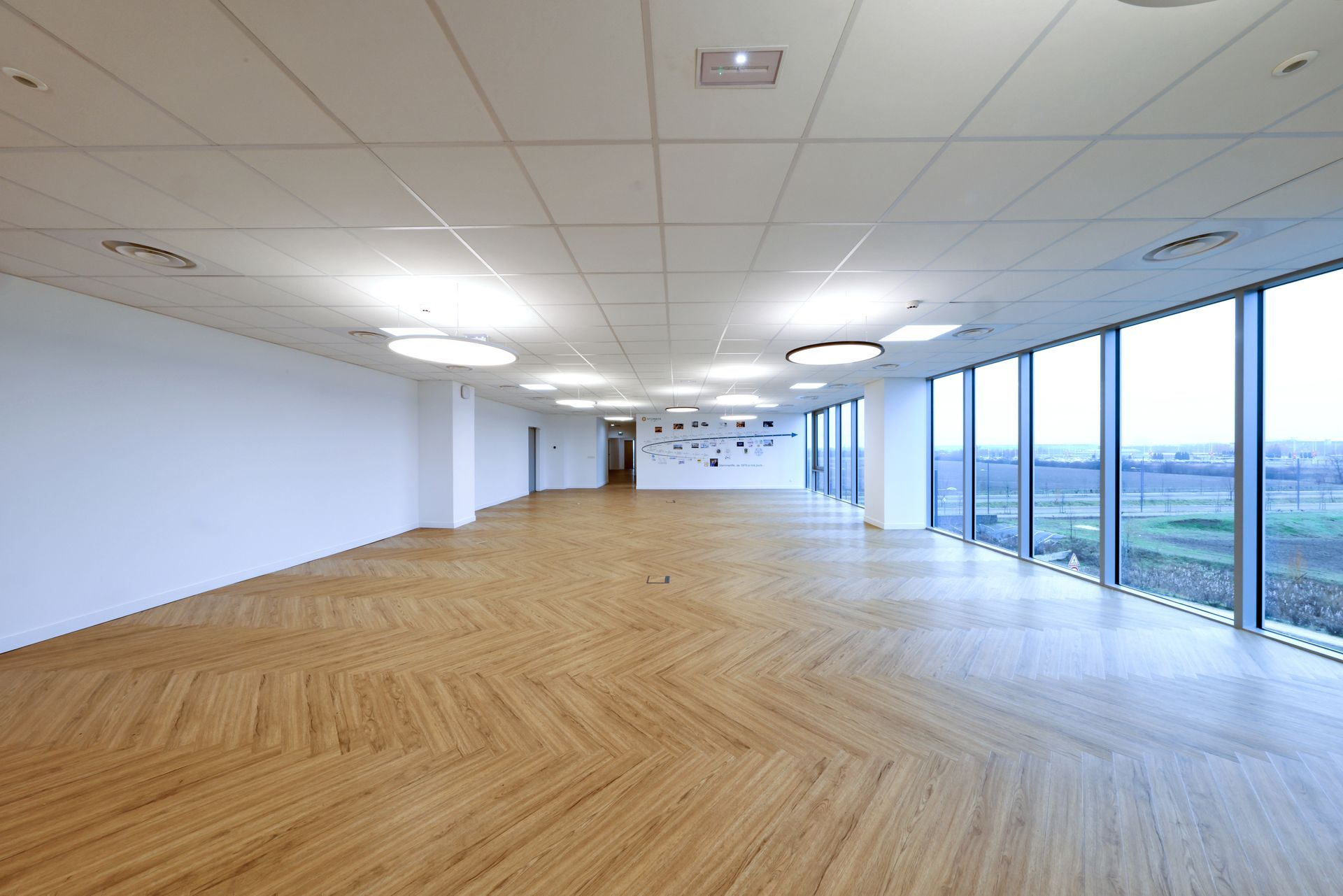 Intervention de Sofrapev pour la rénovation complète d’un espace tertiaire : pose de revêtements de sol, installation de cloisons et travaux de peinture.