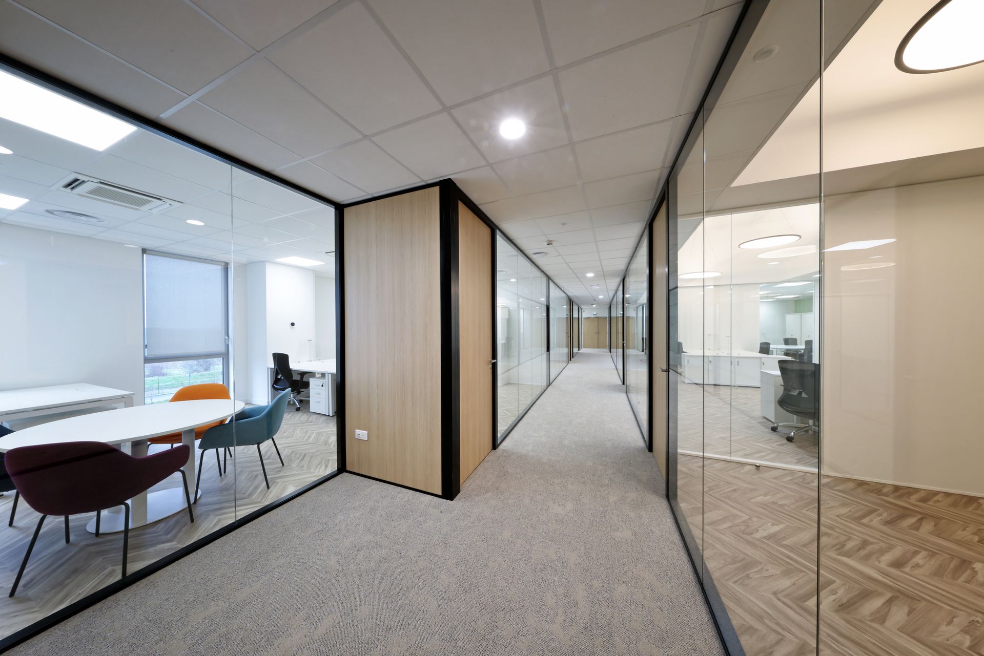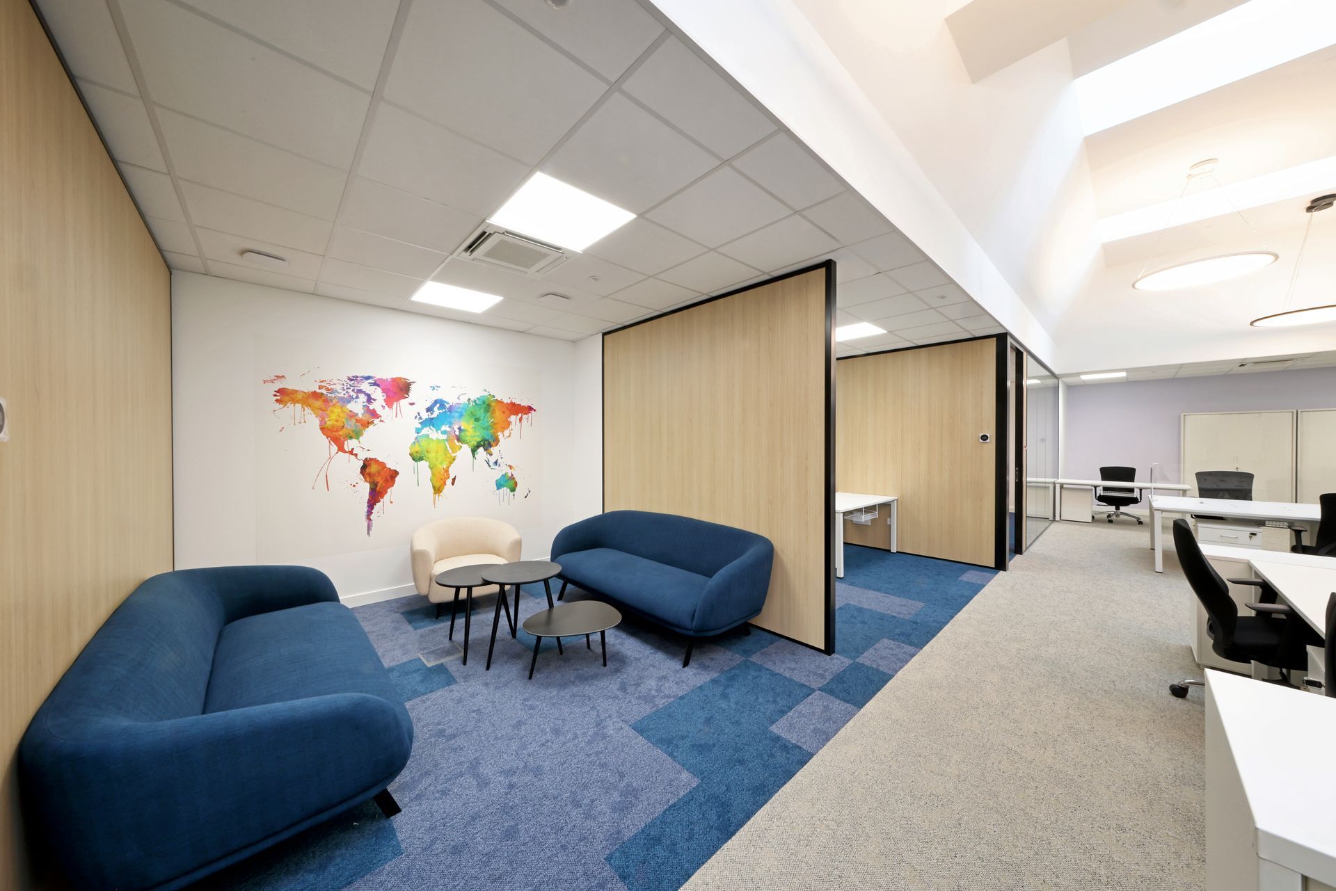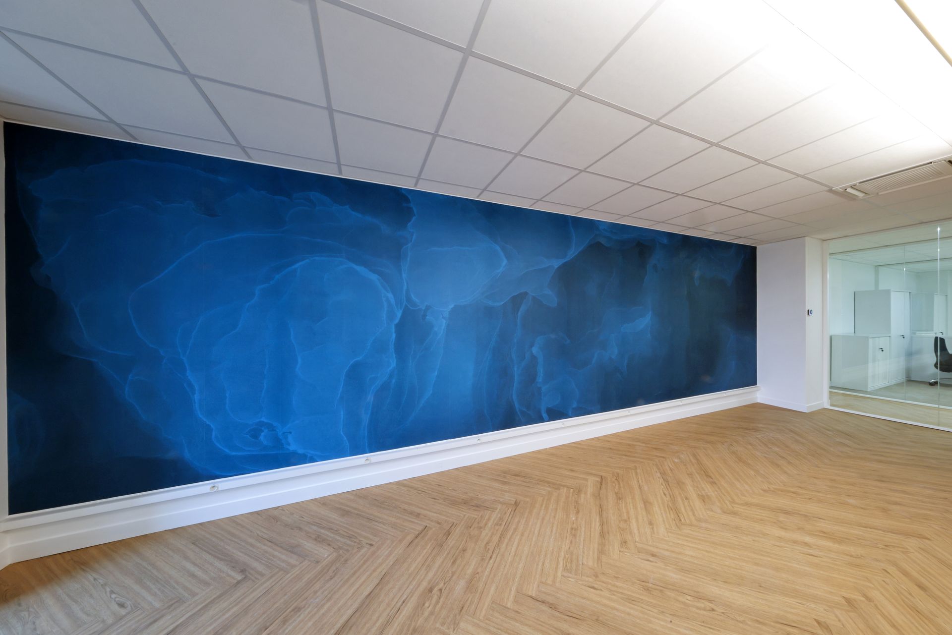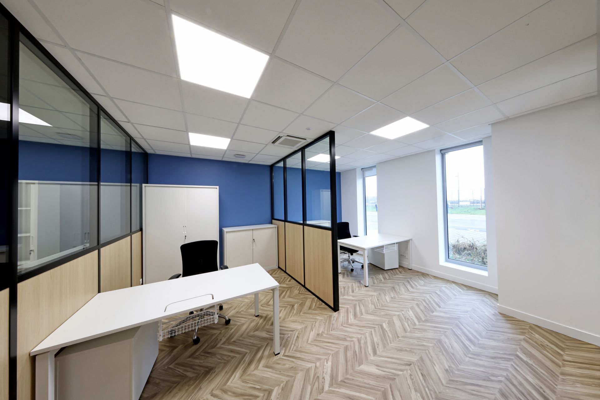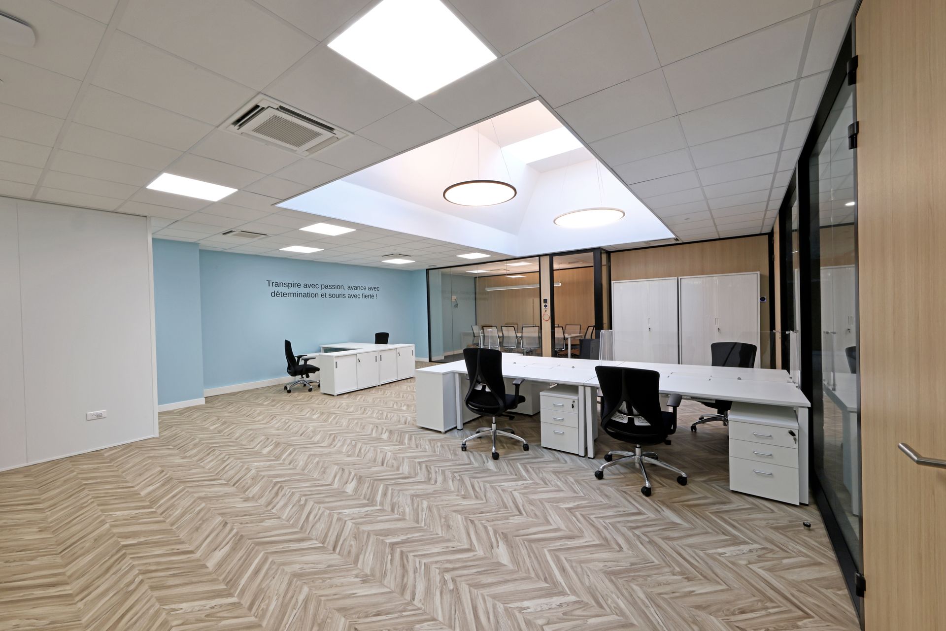 Intervention de Sofrapev pour la rénovation complète d’un espace tertiaire : pose de revêtements de sol, installation de cloisons et travaux de peinture.